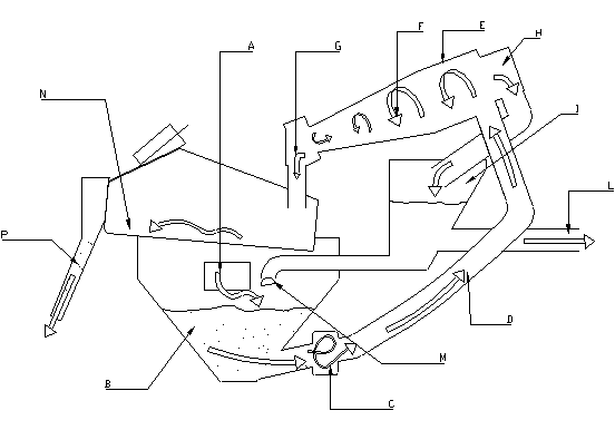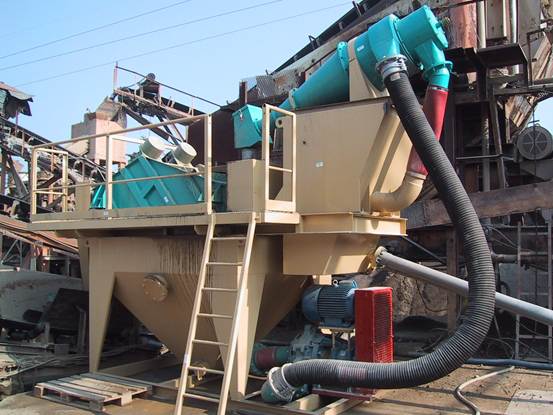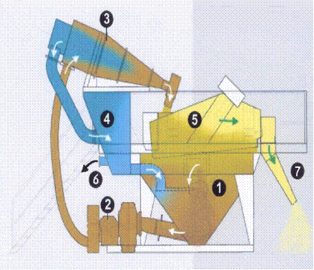 水位控制是由一個浮筒閥(M) (安裝於儲砂桶槽內自動控制),若水位不足則由回收水槽內之水補充,砂漿由抽砂泵(C) 經由管子(D)抽出,其流向為固定沿切線方向進入旋風器,產生一種渦旋(F)之效果,砂顆粒粗於200號篩之料.被離心力拉至圓錐桶之內壁成為濃縮之砂漿進入噴嘴(G)噴下,再進入脫水震動篩網脫水至較乾之砂進入斜槽(P),再由輸送帶將其送出。污水(含淤泥、黏土)直接由旋風器後方進入溢流管(H)再流入旋風器下方之水櫃再由排水管(L)排出。